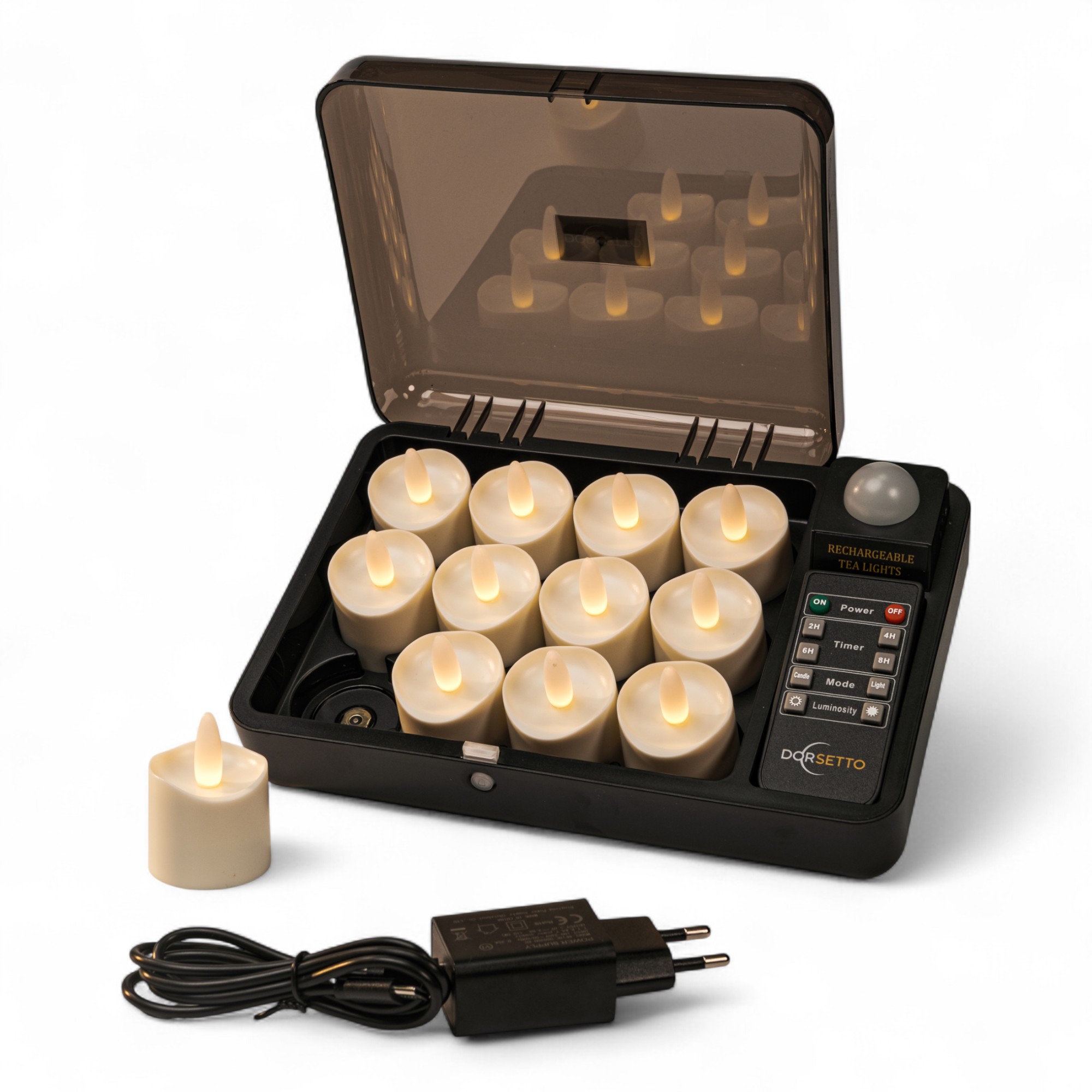 Omdat DORSETTO zijn producten zelf ontwikkelt kunnen wij blijven vernieuwen. Onze waxinelichtjes waren altijd al betrouwbaar maar met deze vernieuwde set gaan wij weer een stap verder. De kaarsjes worden nu geleverd met een nieuwe veilige oplaadbox die het opladen overzichtelijk en stabiel maakt zodat u nog veiliger kunt opladen.
