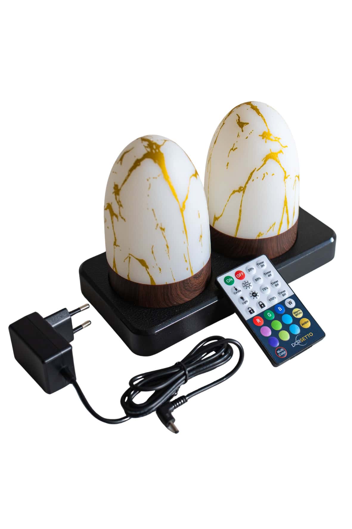 De Tafellamp DORSETTO is een ronde, marmergouden oplaadbare lamp (105 uur) met een houten voet op een zwart vierkant plateau, plus een zwarte voedingsadapter en kleurrijke afstandsbediening. Waterdicht en met afstandsbediening.