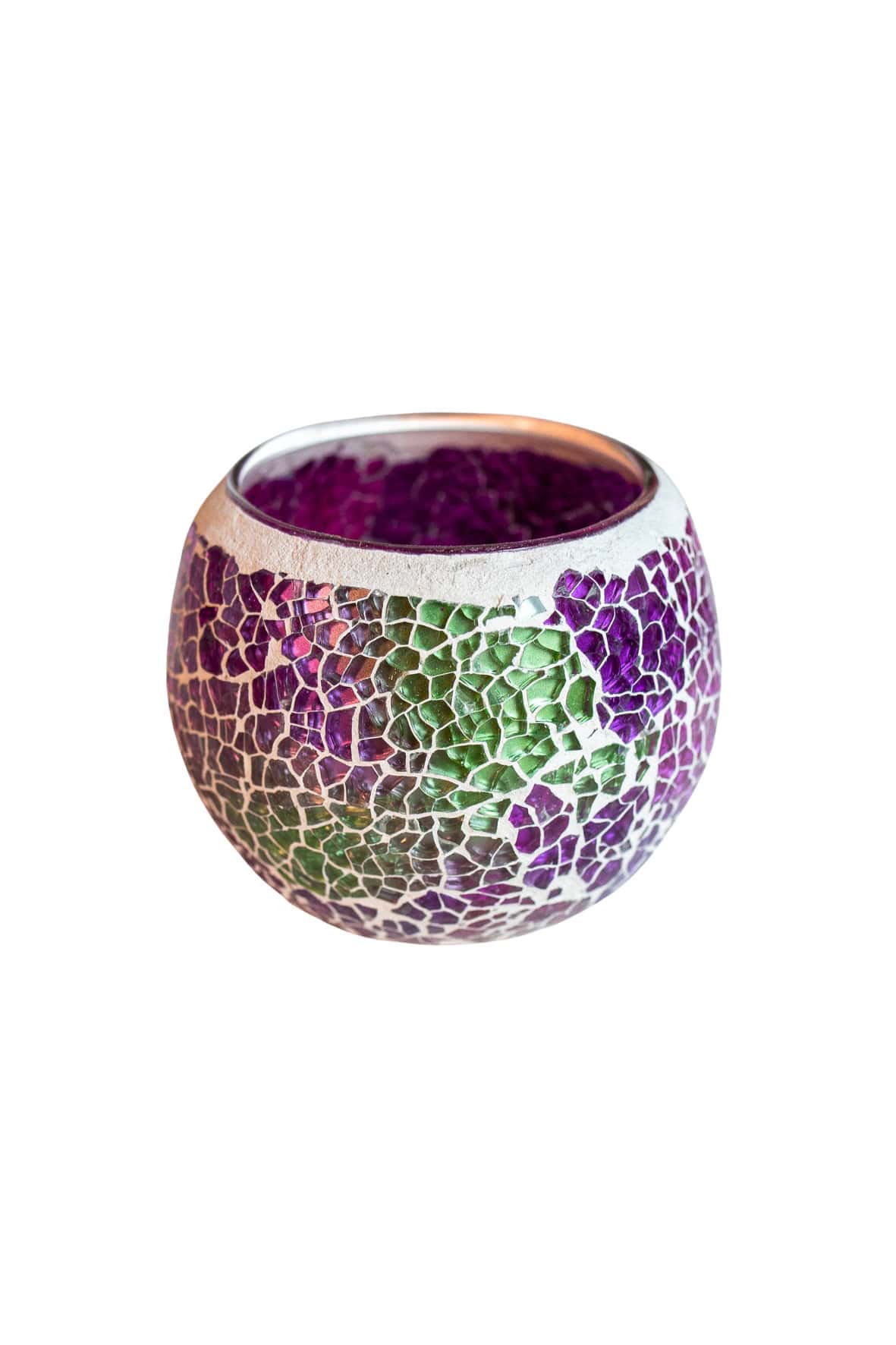De Waxinelichthouder 8,5 CM Dorsetto Purple-Green heeft een rond mozaïekglasontwerp met blauwe, groene en paarse tegeltjes tegen een witte achtergrond.